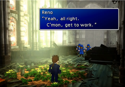 You run across the team, or members of it, throughout the game, and each of them has their own memorable quirk to them. There's Reno, the cool, levelheaded, cynical, experienced one; there's Elena, the one whose inexperience and loose tongue makes all of her scenes entertaining; there's Rude, the quiet, serious one who, deep down, is just as much of a dork as the rest of them; and then there's Tseng, the leader who... uh... he certainly, uh, exists.